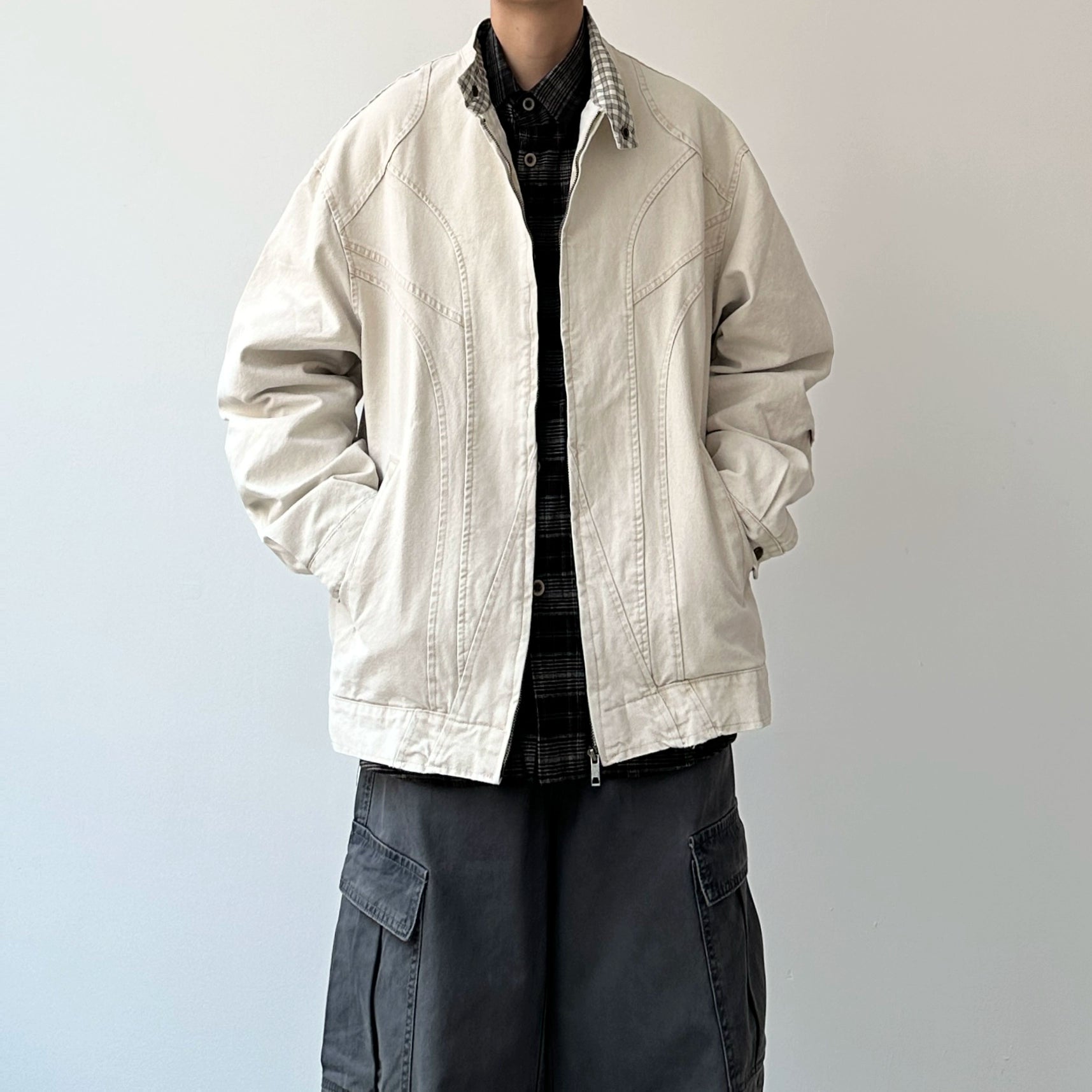 緩やかなカーブステッチが印象的なライトジャケットです。