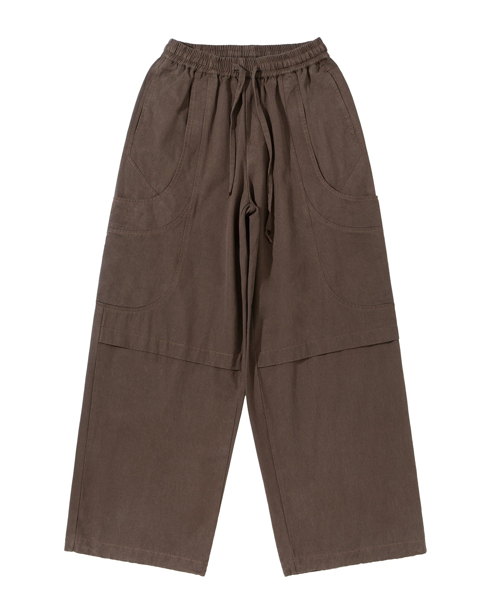 大きめカーブポケットと膝切り替えが際立つ、深い股上のワイドパンツです。