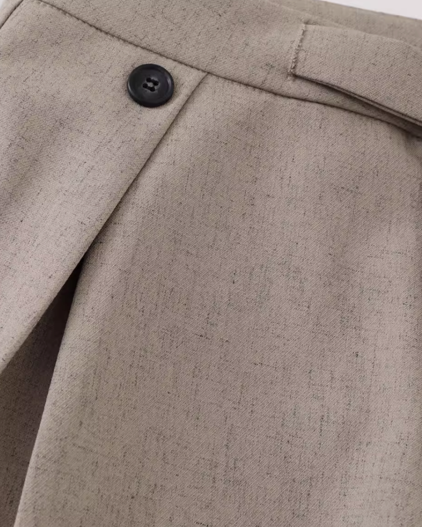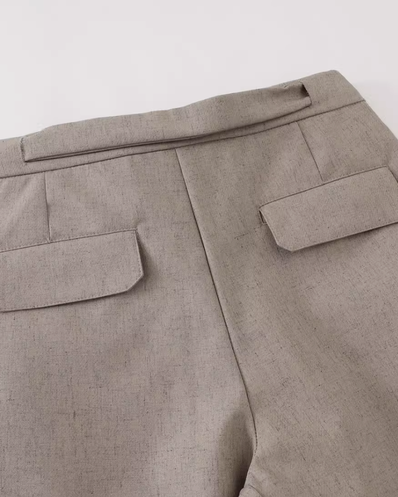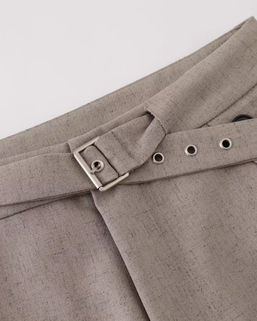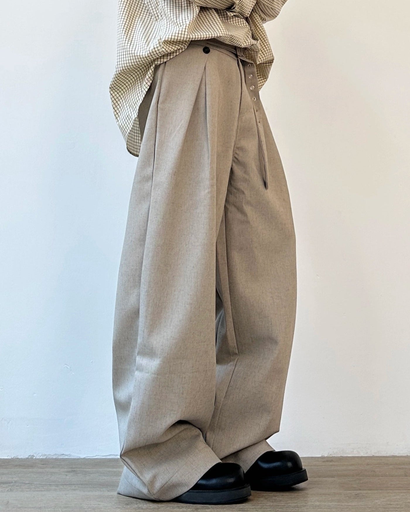 腰位置をすっきり見せるベルトディテールで、落ち感のある生地が足もとへ自然に流れます。