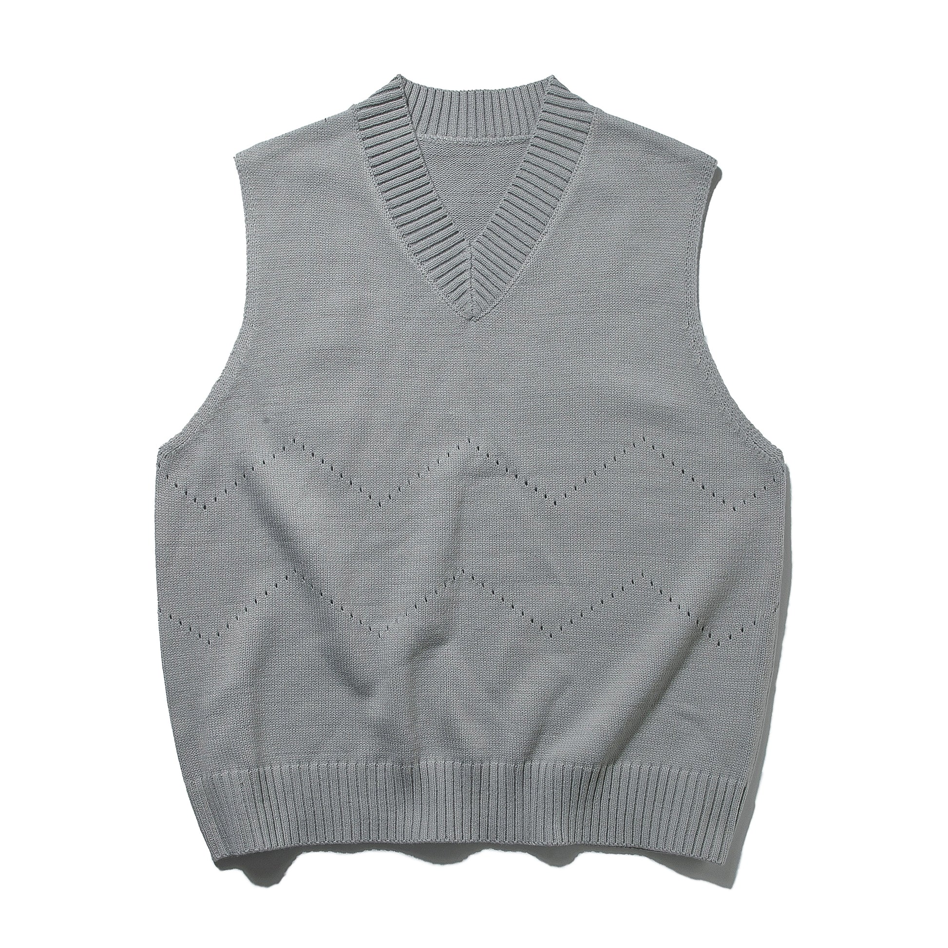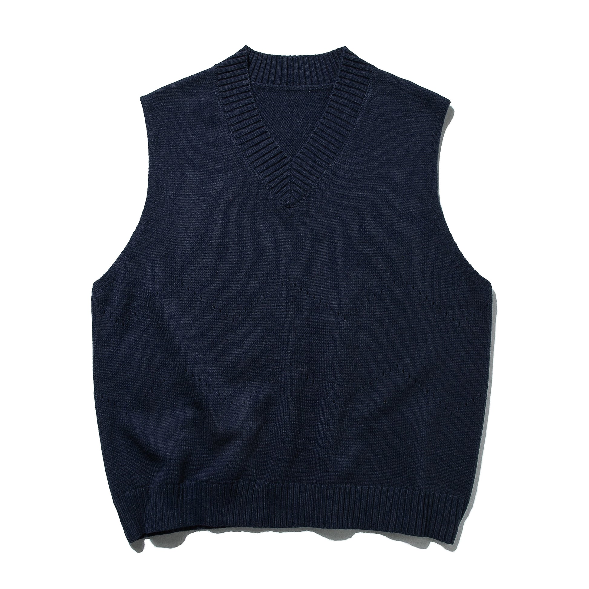 ゆるやかなVネックと控えめなパターンが、表情のあるシルエットを描くニットベストです。