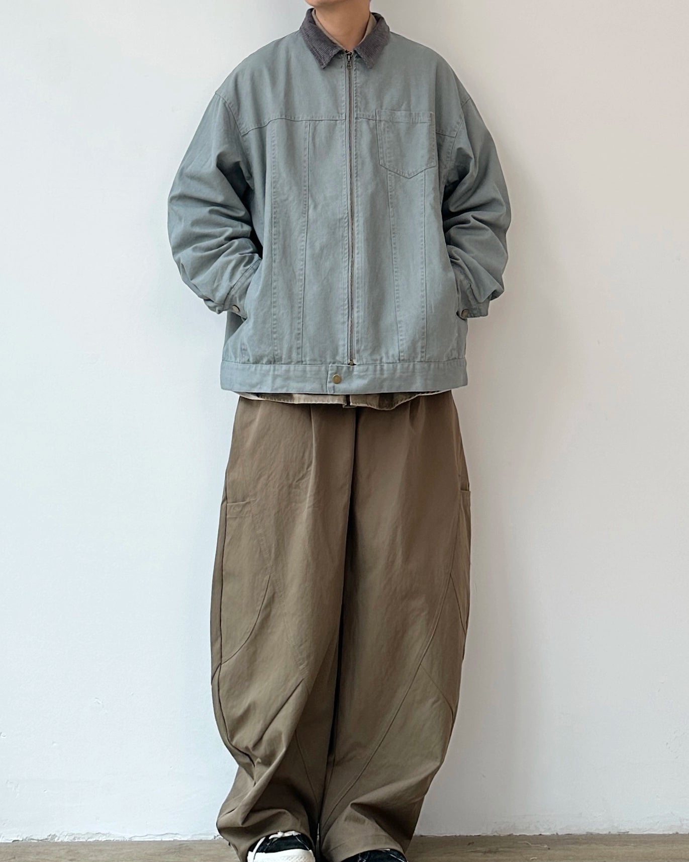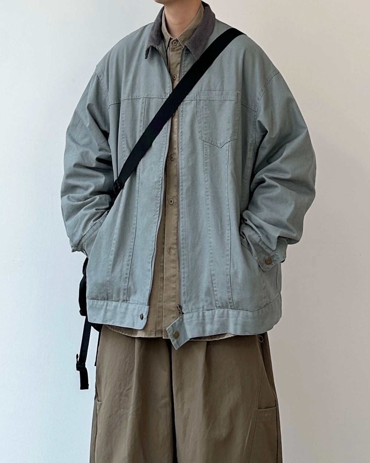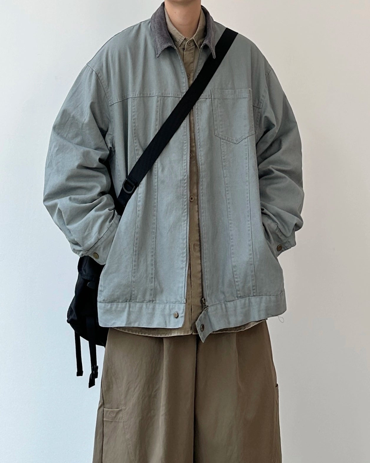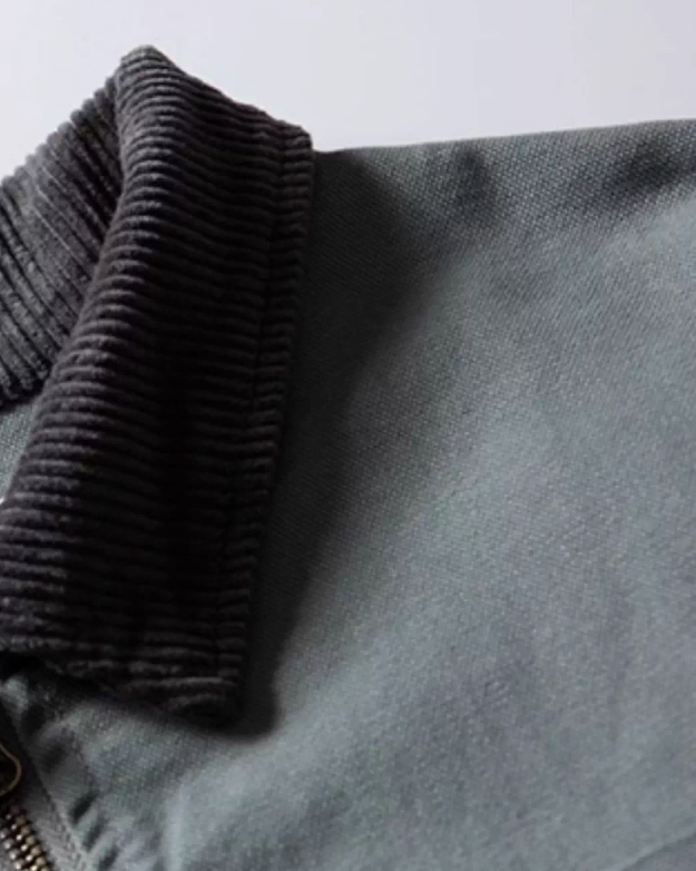 落ち着いたトーンにコーデュロイの衿を添えたジップジャケット。