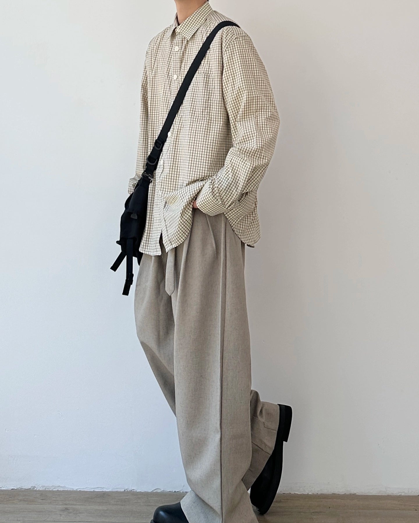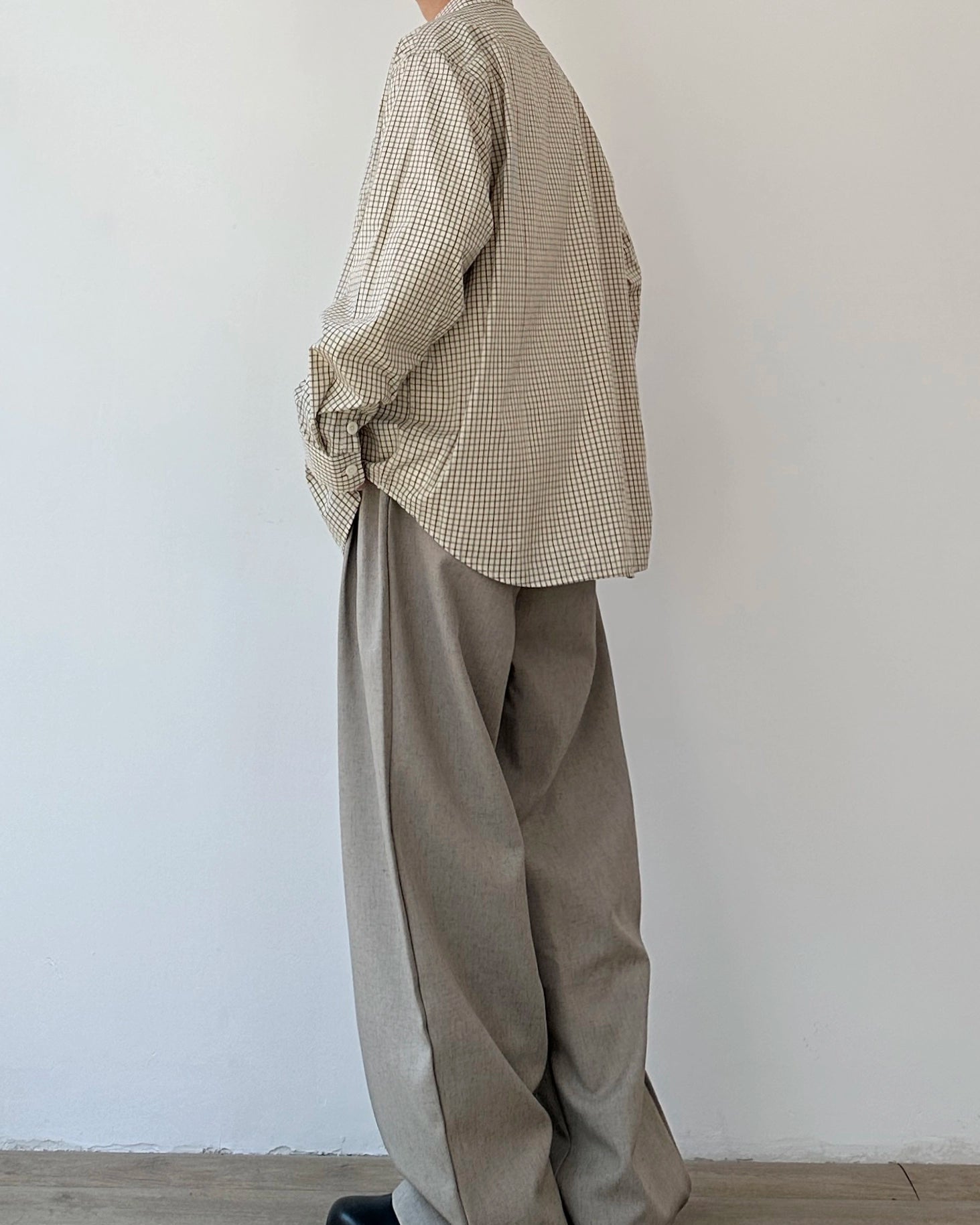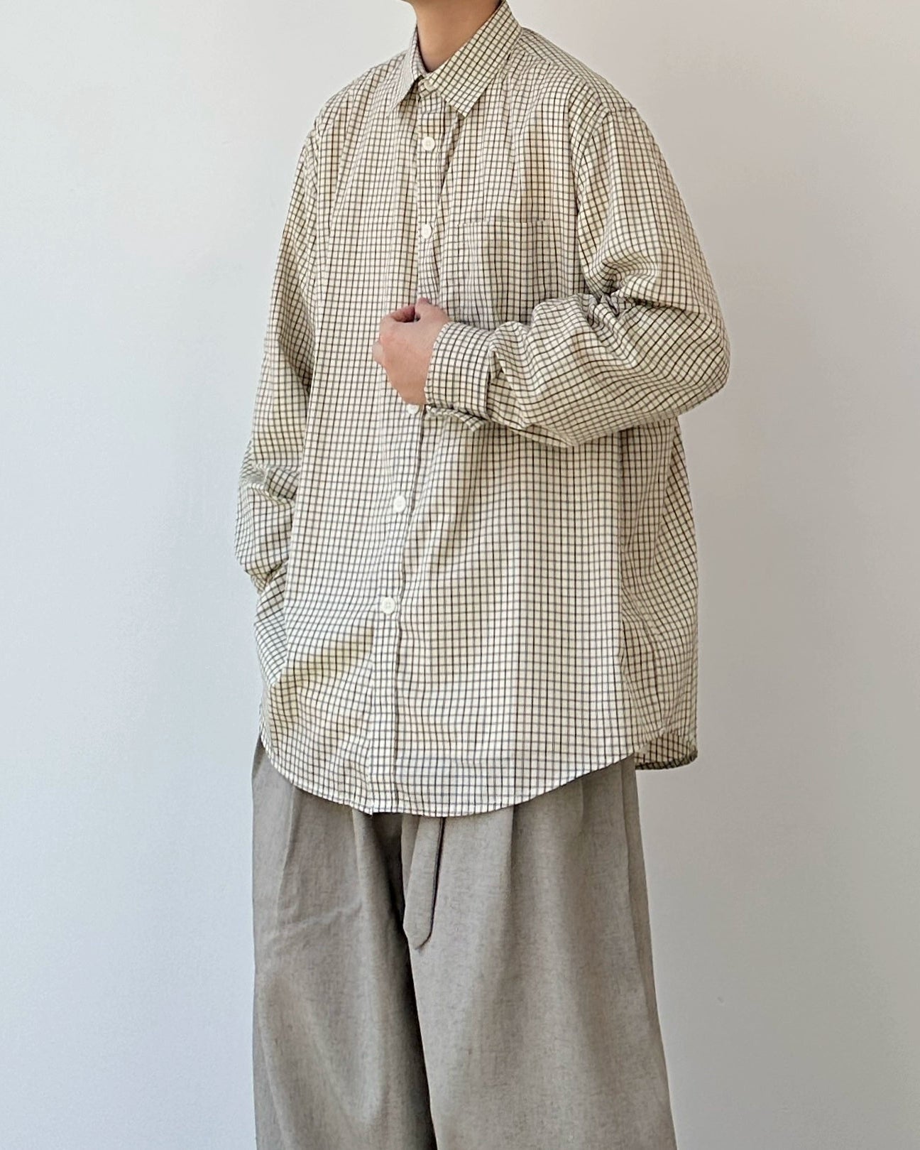 ベージュ基調の細かなチェックが柔らかく映える、ゆったりオーバーサイズのシャツです。