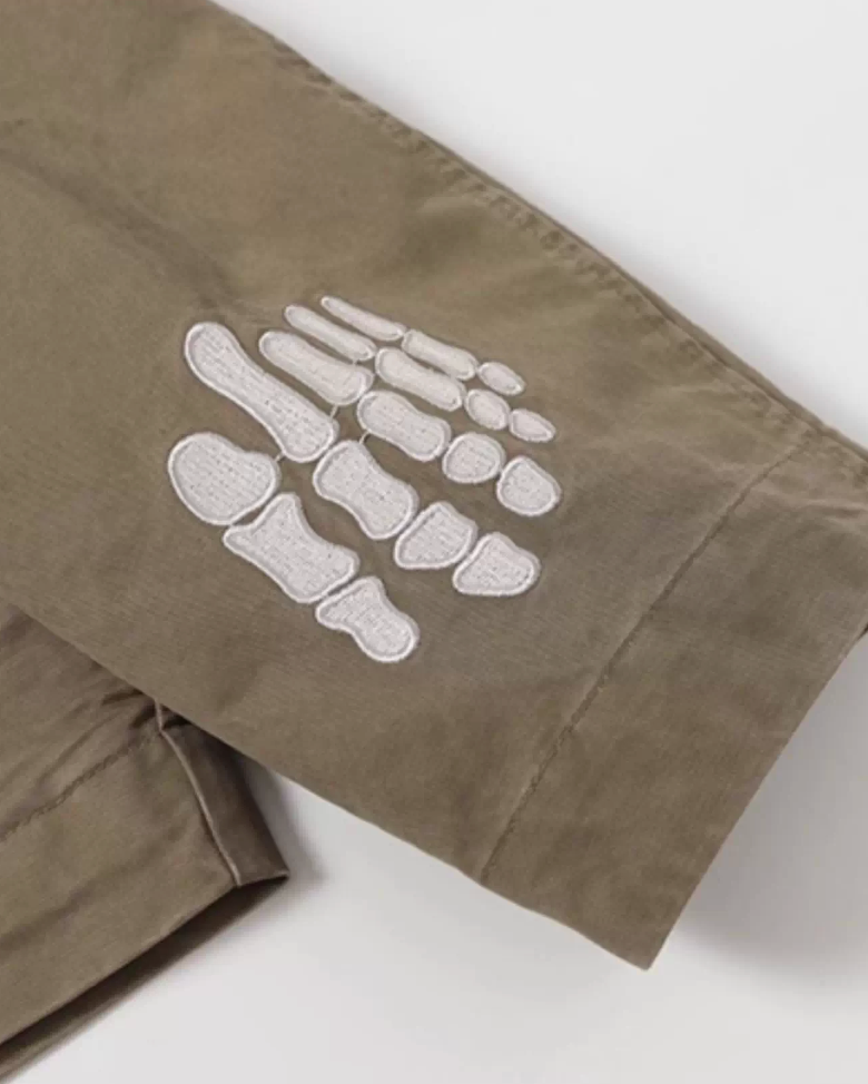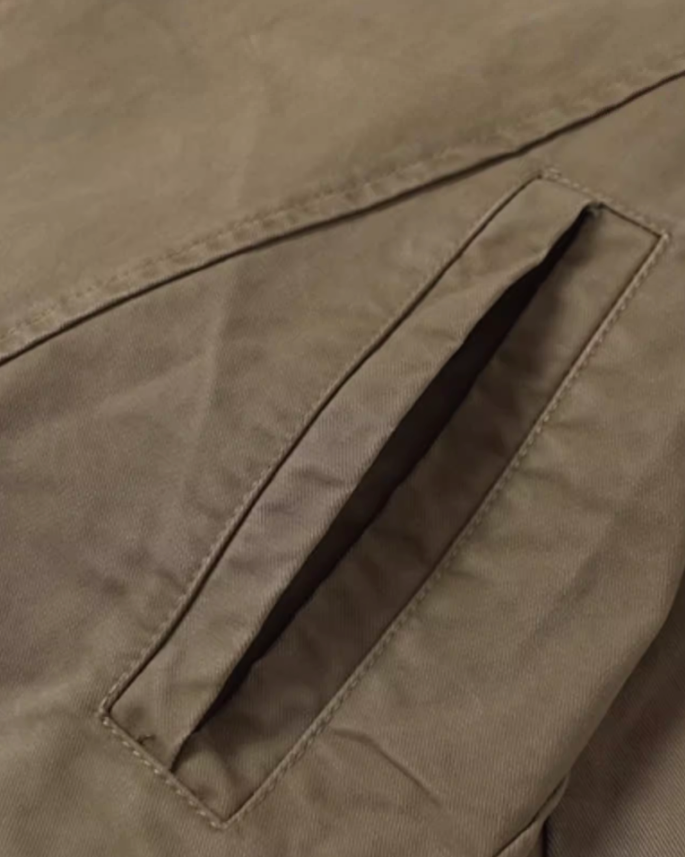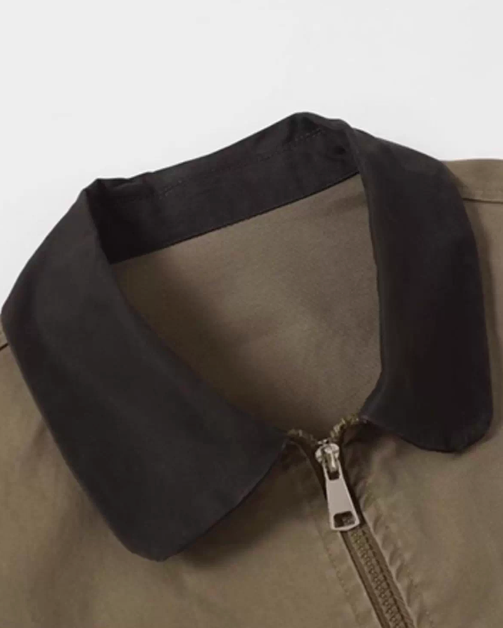 襟元や袖口に配されたコントラストカラーがアクセントとなり、ワーク感の中にさりげない遊び心をプラス。