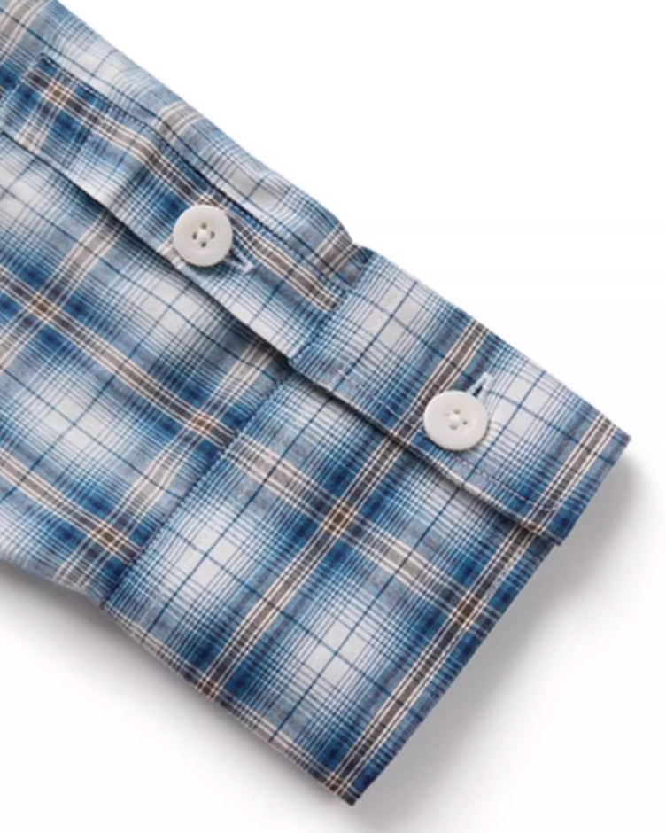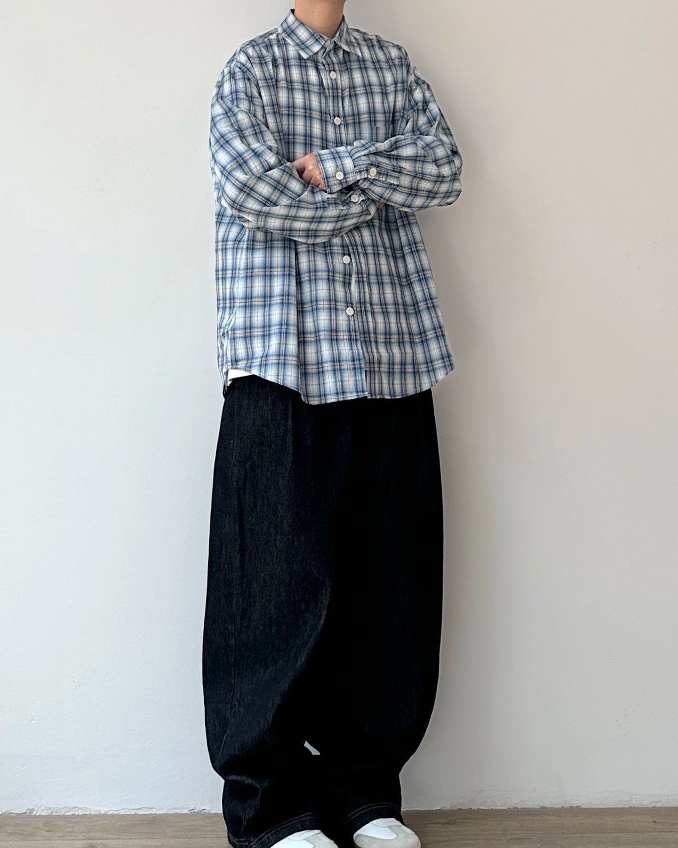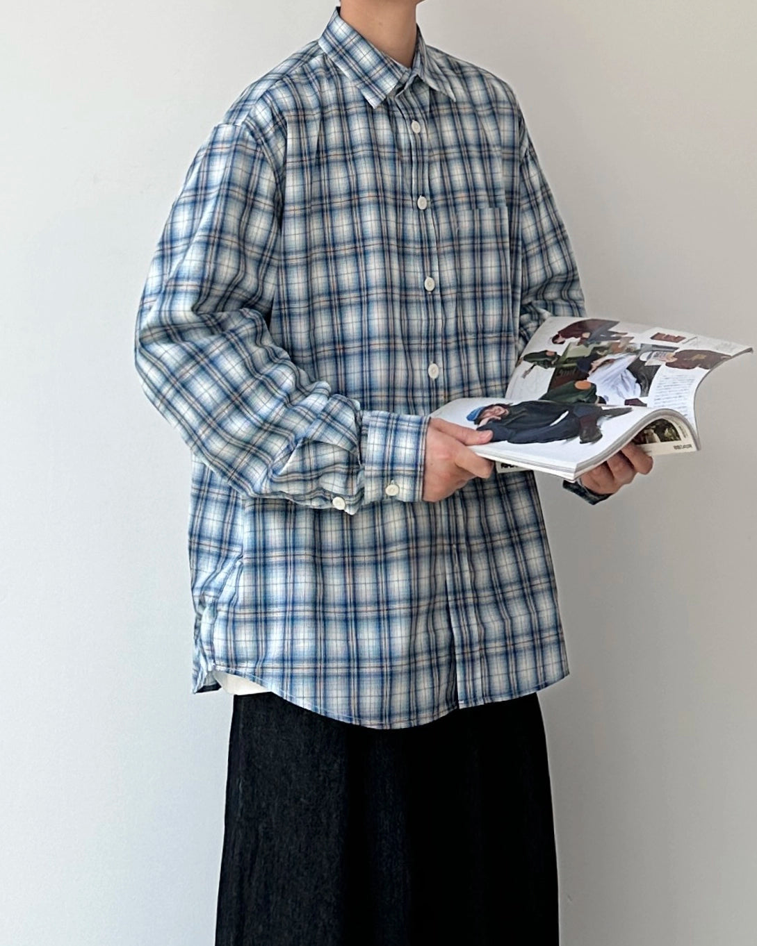 ブルーのチェックが柔らかく映える、ゆったりオーバーサイズのシャツです。