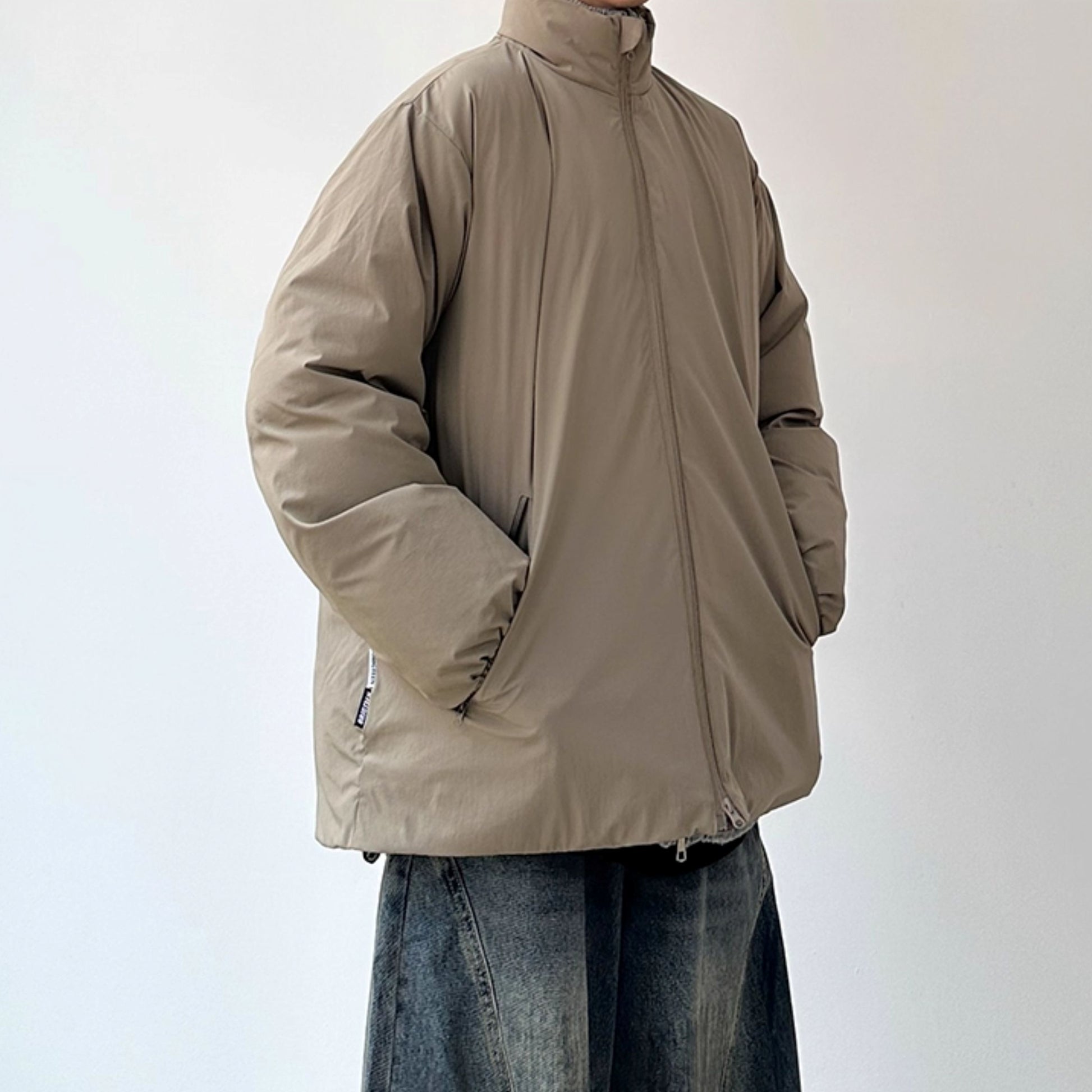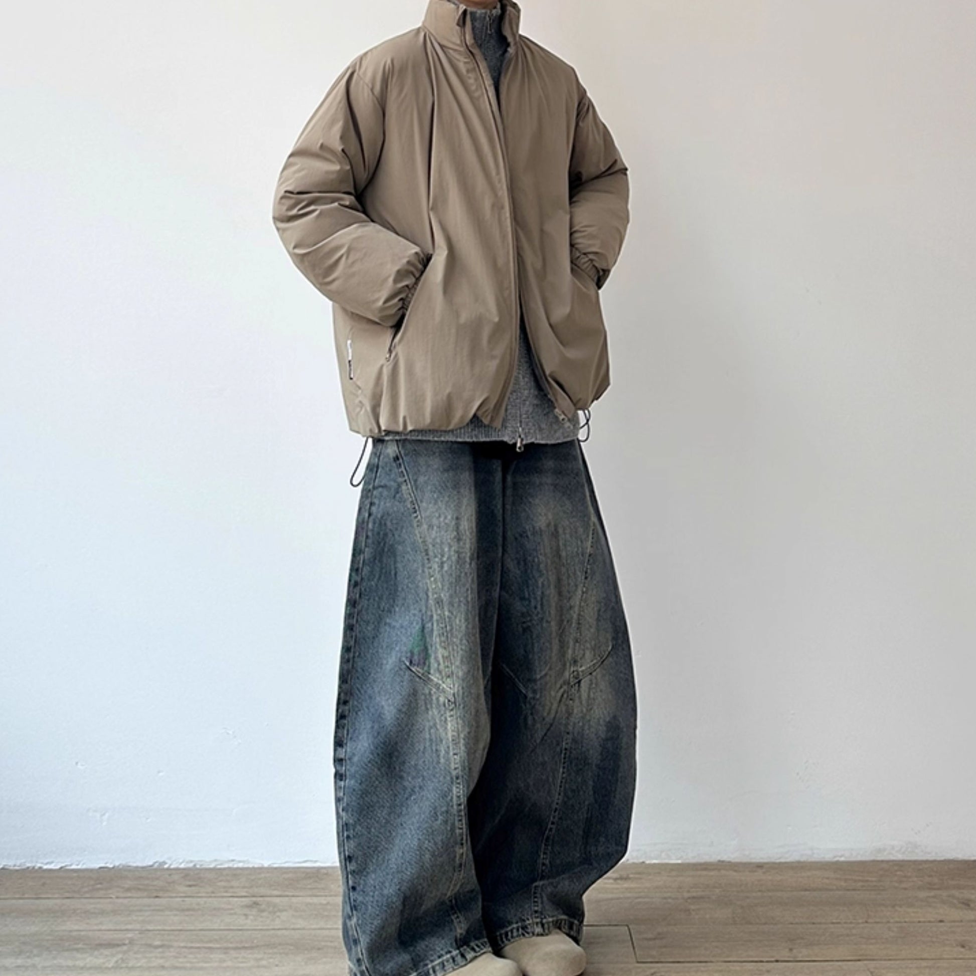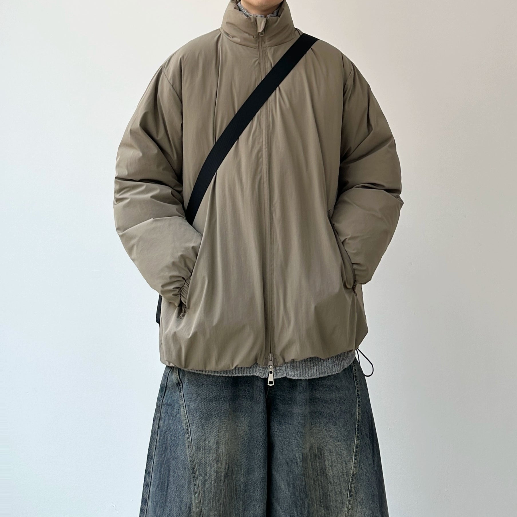 肩まわりの落ち感がラフさを生み、スタンドカラーがすっきりとした印象に整えます。