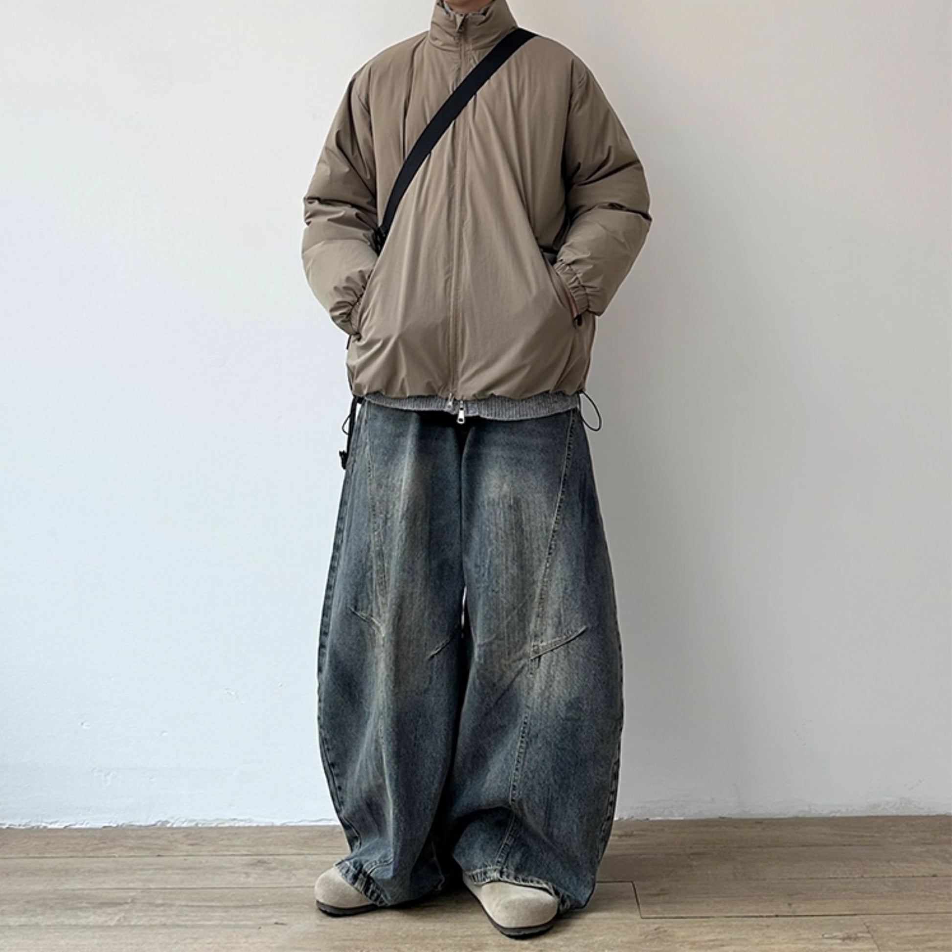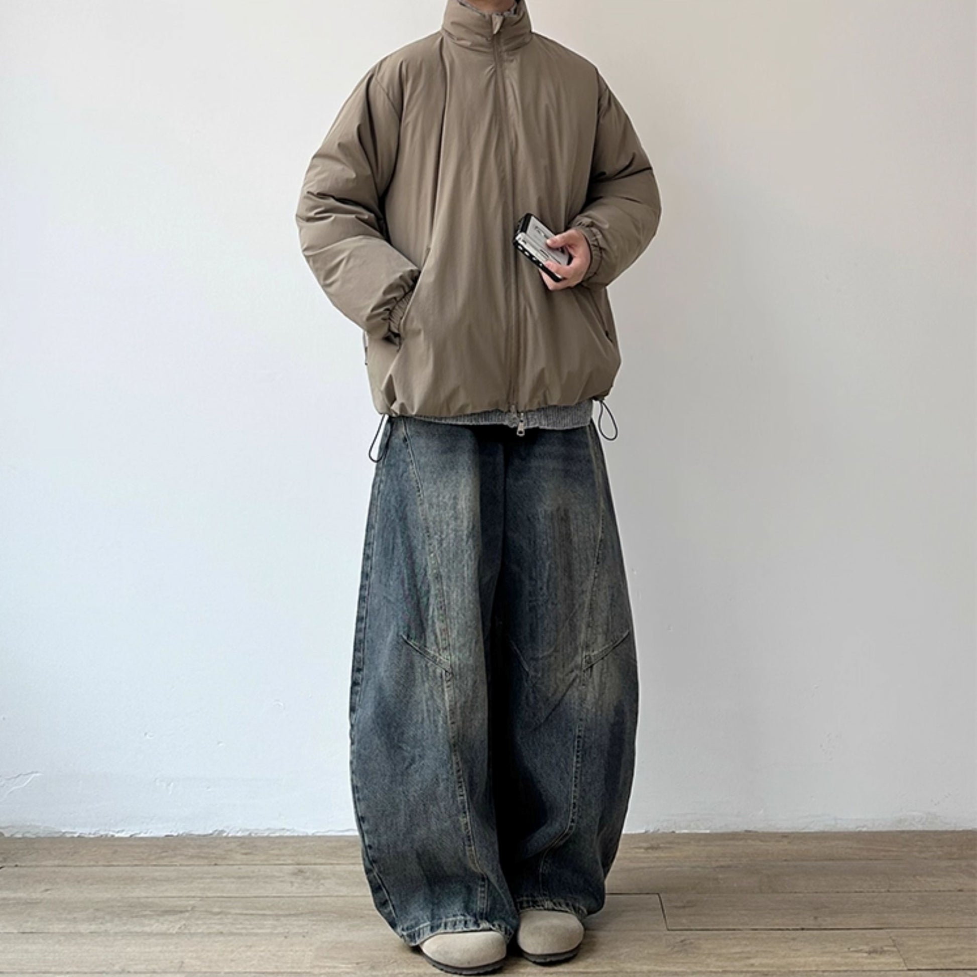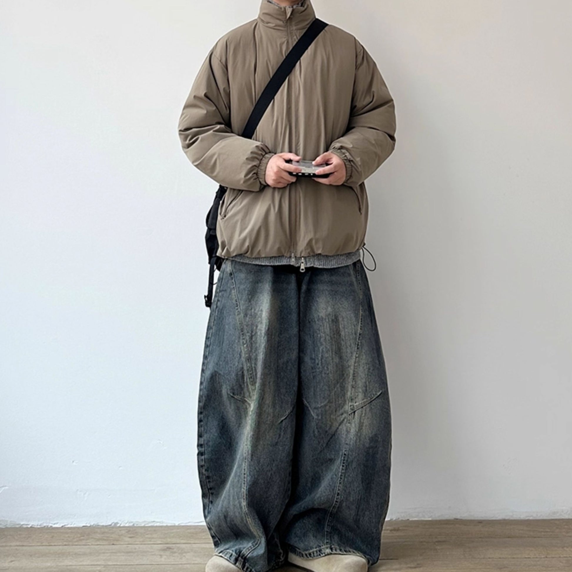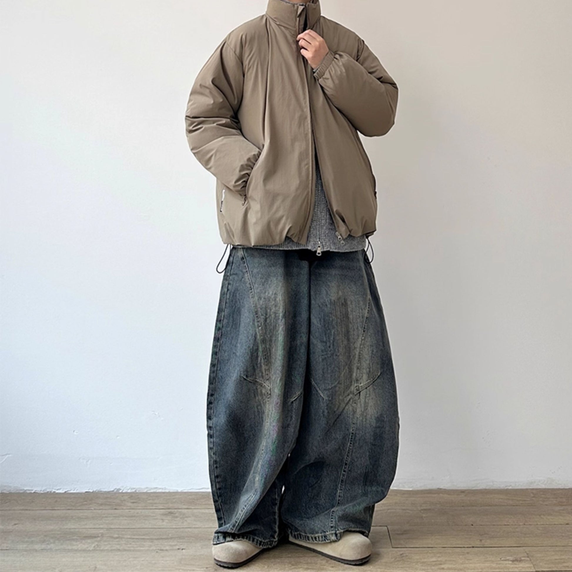 肩まわりの落ち感がラフさを生み、スタンドカラーがすっきりとした印象に整えます。