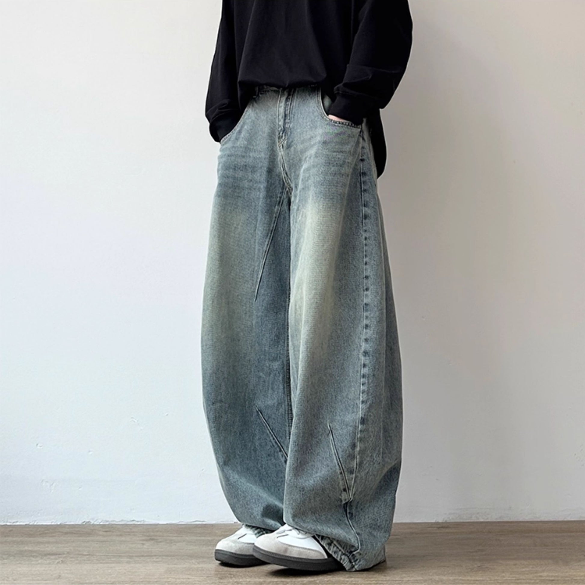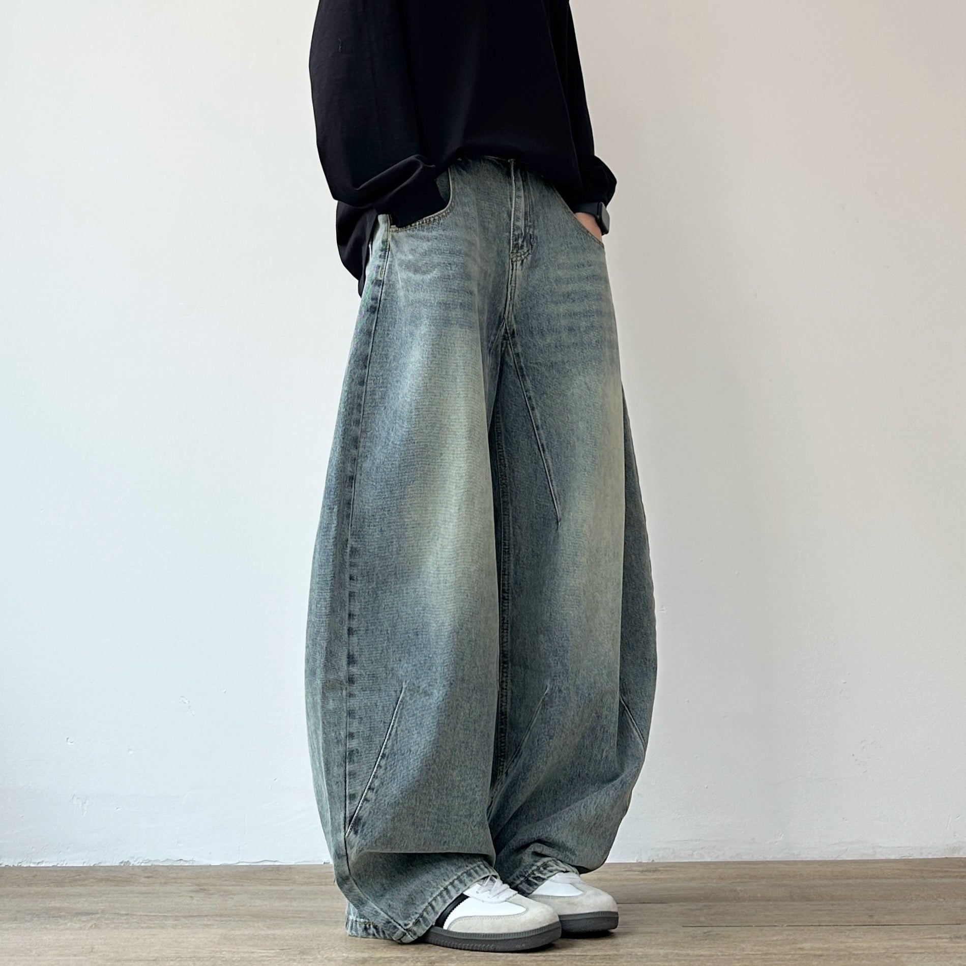 丸みを帯びた極太シルエットが特徴のワイドデニムパンツです。