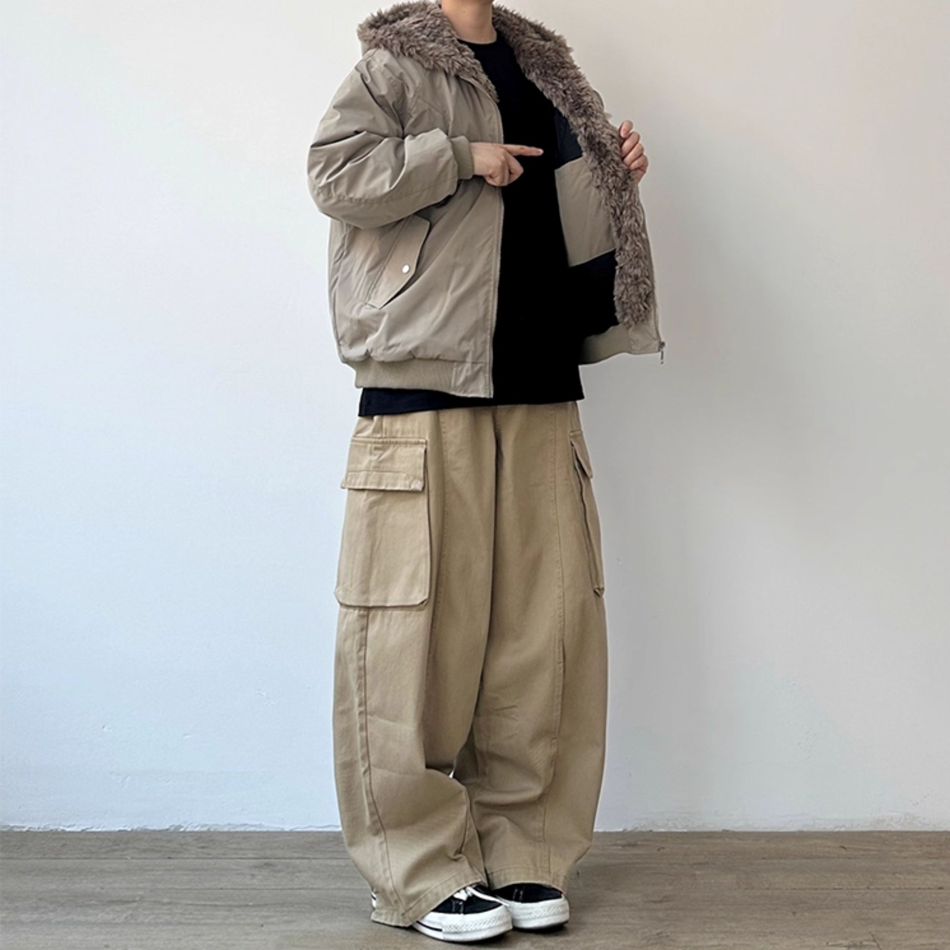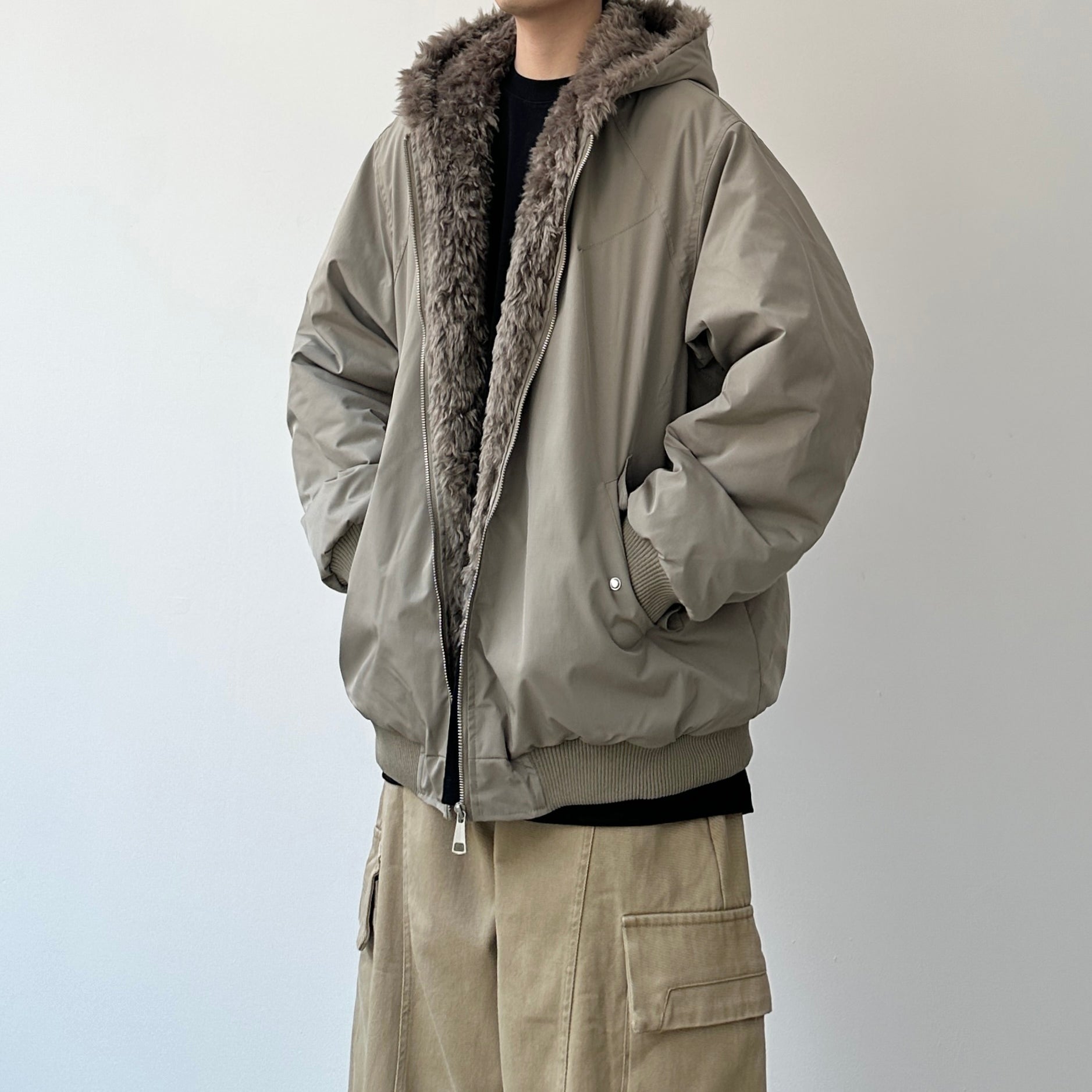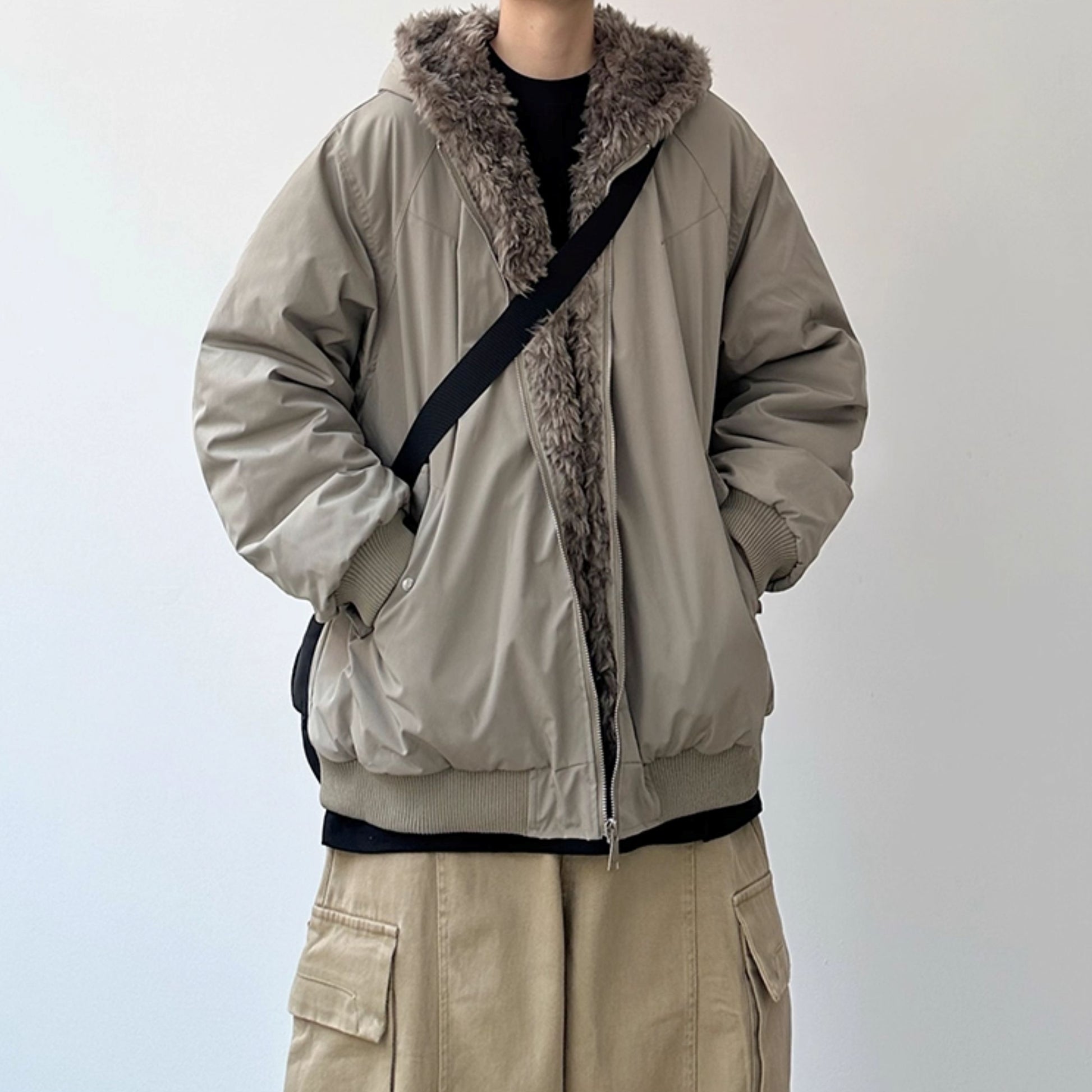 ファーフードの質感が季節感を添えつつ、ラフさと落ち着きのバランスを保ちます。
